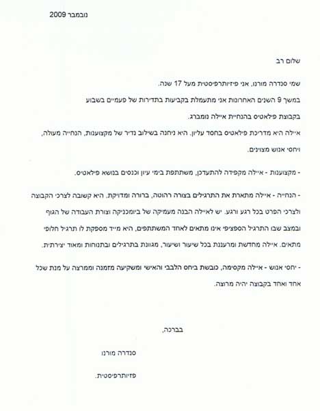 אני מציעה לכל מי שמעוניין בשיקום או קידום יכולתו הפיזית, בין ממצב של קושי תפקודי, בין ממצב שלפני ניתוחים ובין לאחריהם, ובין מי שמעוניין בשיפור איכות חייו ממקום בונה, איכותי ונכון - ללמוד אצלה. ומעל לכל היא פשוט בחורה מקסימה ואנחנו אוהבות אותה מאד ומאד נהנות בשעוריה.